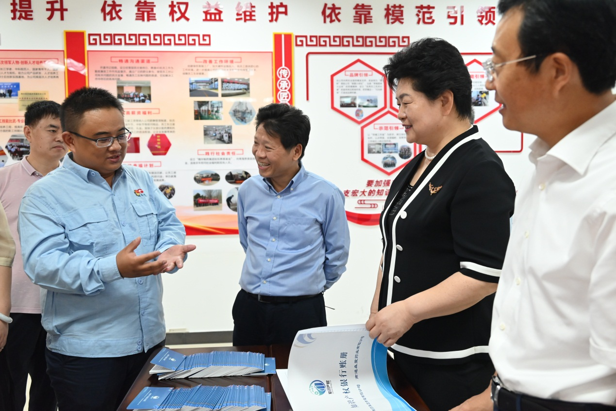 公司董事長(zhǎng)、總經(jīng)理袁擁軍代表公司全體員工對(duì)蔡毅德一行表示熱烈的歡迎,并陪同參觀了公司黨群活動(dòng)室、產(chǎn)改工作室,詳細(xì)介紹了在公司“五彩黨建”引領(lǐng)下,以“五個(gè)依靠、五心工程”為抓手開展的一系列產(chǎn)改工作。袁擁軍匯報(bào)了公司近年來(lái)在黨建工作、生產(chǎn)經(jīng)營(yíng)、科技創(chuàng)新、人才培養(yǎng)、產(chǎn)業(yè)工人改革等方面取得的優(yōu)異成績(jī)。調(diào)研過程中,來(lái)訪人員饒有興趣的了解了公司 “員工幸福計(jì)劃”、“知識(shí)產(chǎn)權(quán)銀行”制度、“青藍(lán)工程”等亮點(diǎn)工作和做法,并給予高度肯定。袁擁軍向來(lái)訪人員贈(zèng)送了由公司黨員和管理骨干開展讀書征文活動(dòng)編撰的 “單位如家、感恩有我”、“奮斗如歌”、“責(zé)任如磐、攻堅(jiān)有我”系列叢書。